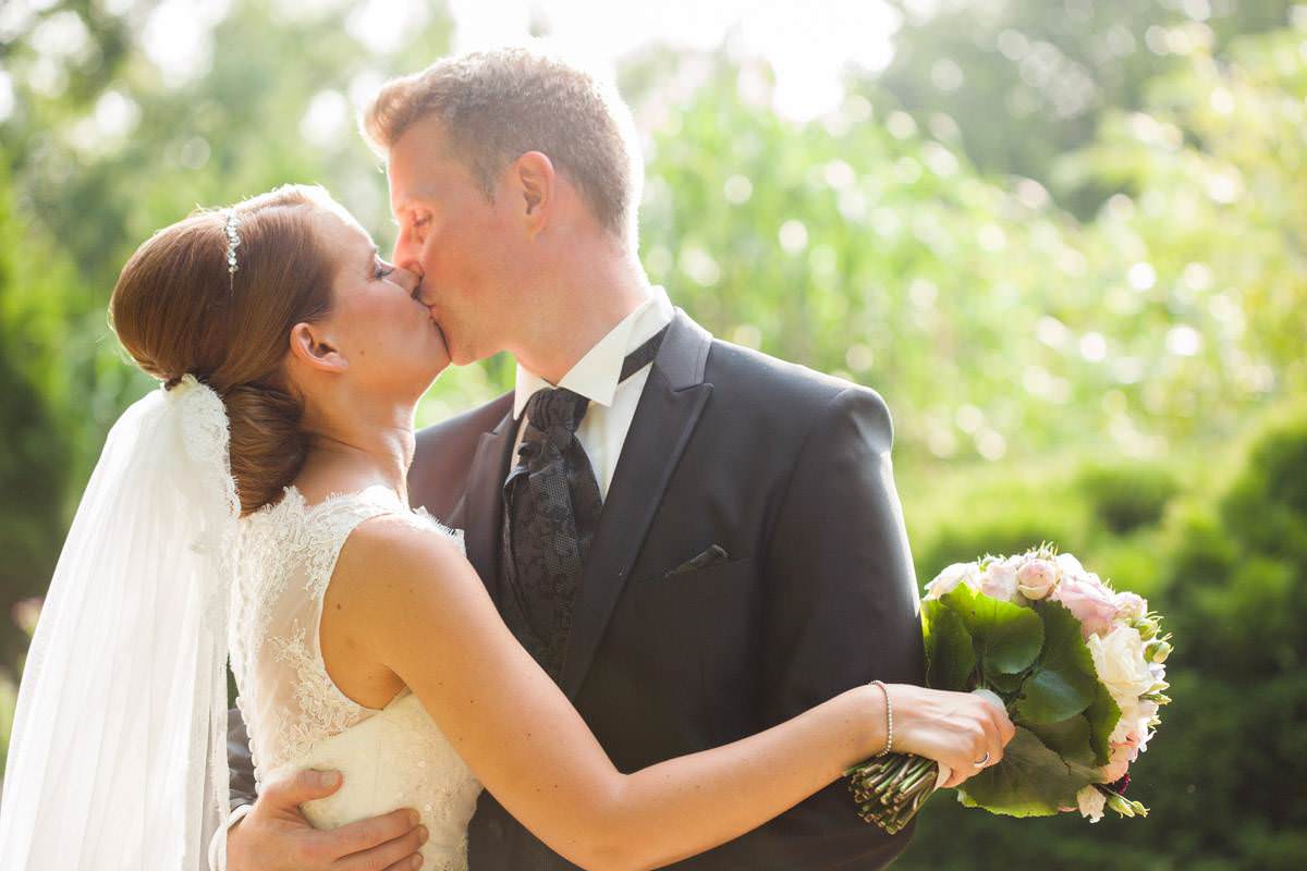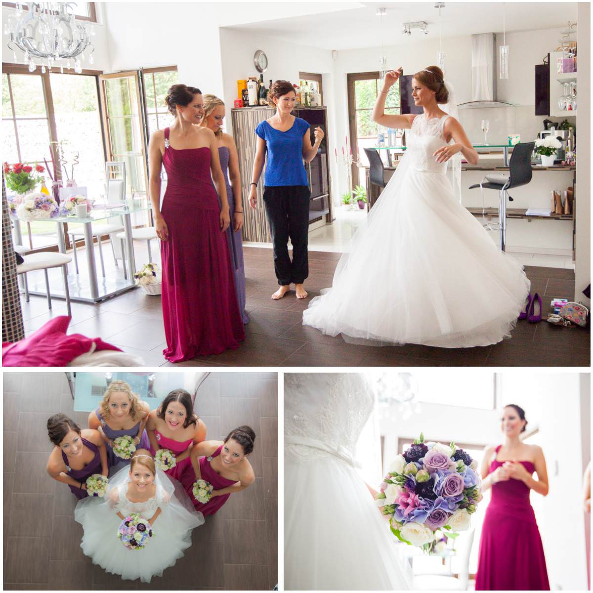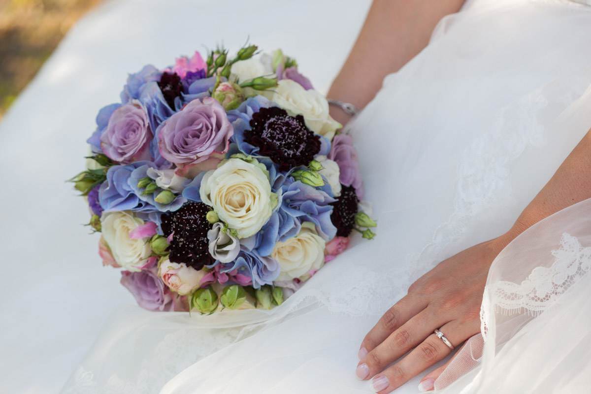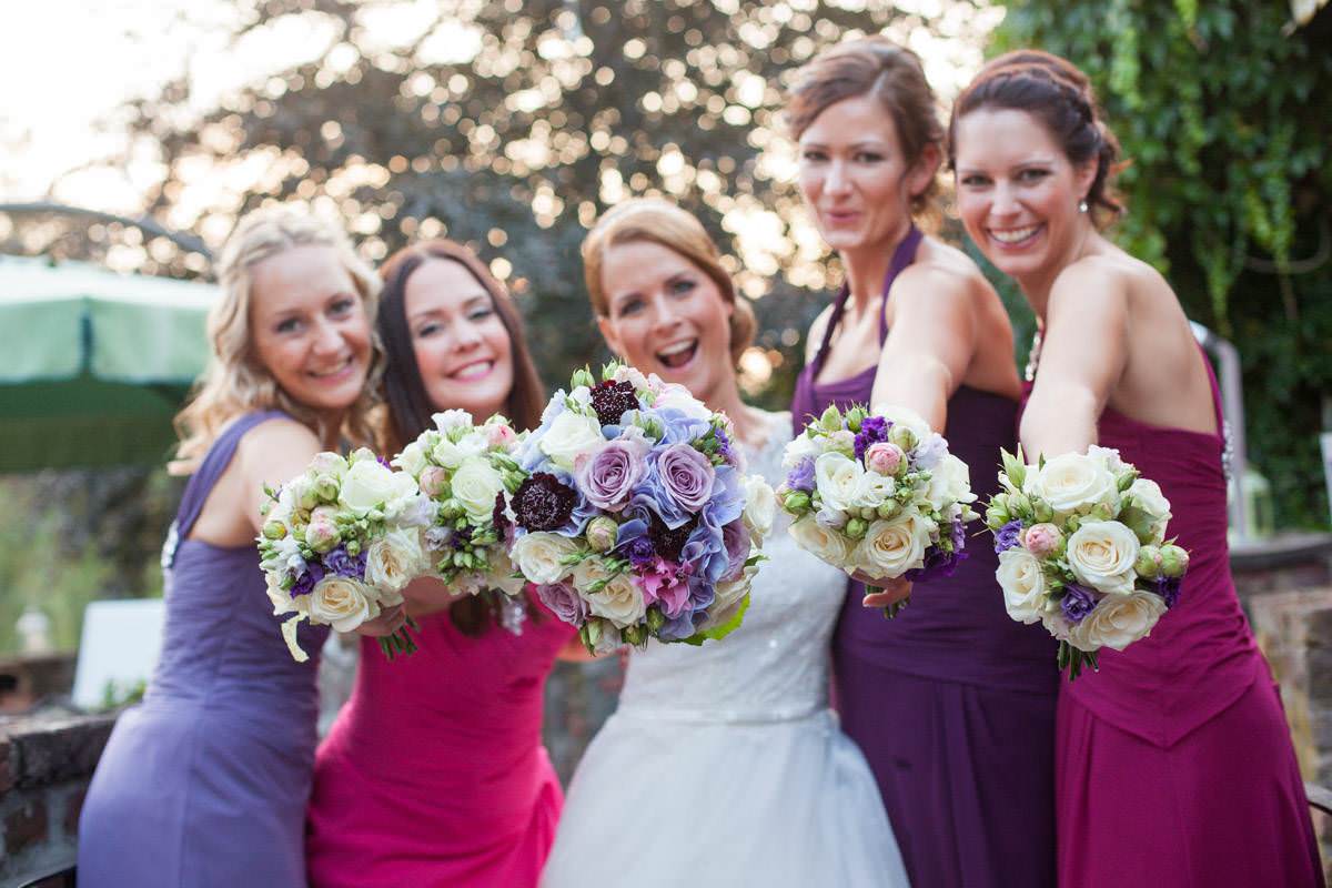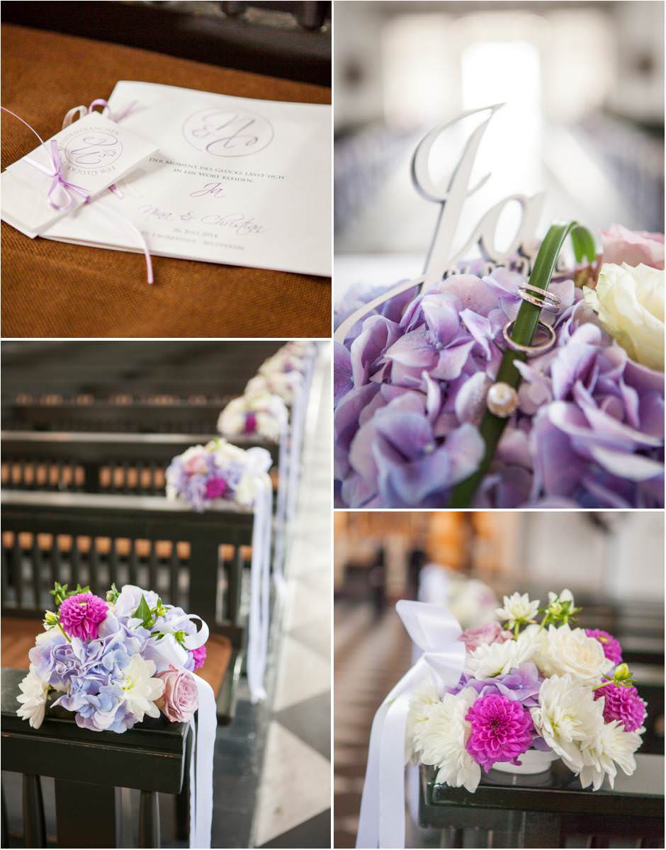 Bei der Ankleidung hatte Nina ihr liebsten Freundinnen dabei, die sie den Tag über als ihre Brautjungfern begleiten würden. Bei einer sehr feierlichen Trauung gaben sich die Beiden ihr Eheversprechen. Der Kirchplatz war mit Sonne gesegnet an diesem Tag und so bot der Sektempfang für alle Gäste eine sommerliche Erfrischung. Die Hochzeitsfeier fand dann auf Gut Höhne statt. Die Tischdekoration, wie auch der Brautstrauss waren in zartes Lila getaucht. Hier liessen es sich alle bis in die Nacht gut gehen und feierten bis zum Morgen!