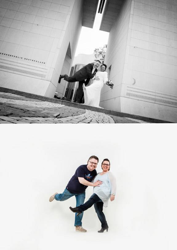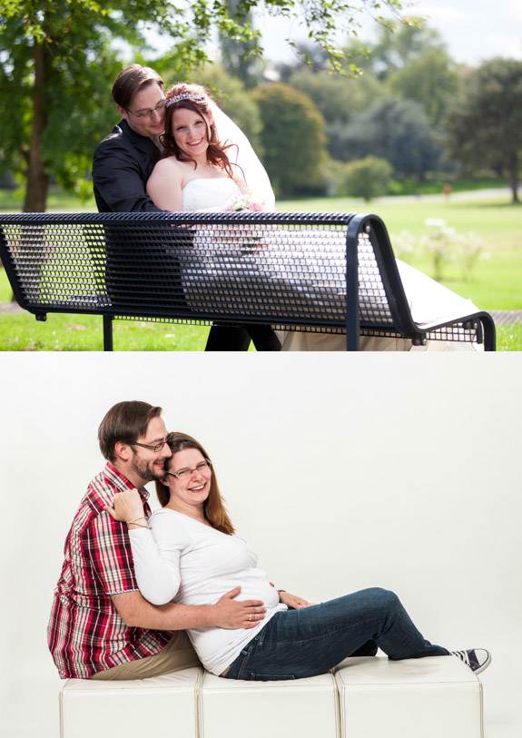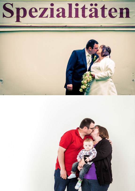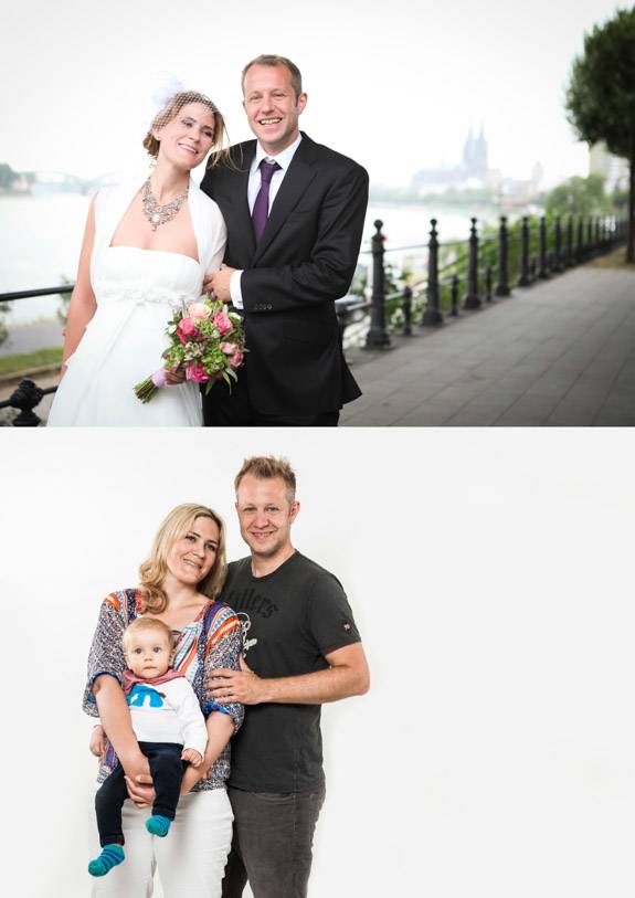 Eigentlich schade…wenn man sich aus den Augen verliert… Vor der Hochzeit treffen wir unsere Paare einige Male. Wir machen eine schöne Portrait Serie mit ihnen – dann sehen wir uns natürlich am Tag der Hochzeit… vielleicht auch noch einmal danach. Und dann? Aus den Augen aus dem Sinn? Nein, das wollen wir nicht! Daher haben wir vor zwei Wochen ein kleines Studio-Sommerfest gemacht und alle unsere ehemaligen Brautpaare dazu eingeladen! Es war einfach wundervoll so viele Paare – einige nach vielen Jahren – endlich mal wieder zu sehen! Und viele hatten ihren Nachwuchs dabei! Wir hatten die Paare gebeten, sich ein Lieblingsfoto ihrer Hochzeit auszusuchen, das wir dann – in Alltags-Klamotten und mit Kindern – im Studio nachstellen. Hier das Ergebnis 😀
